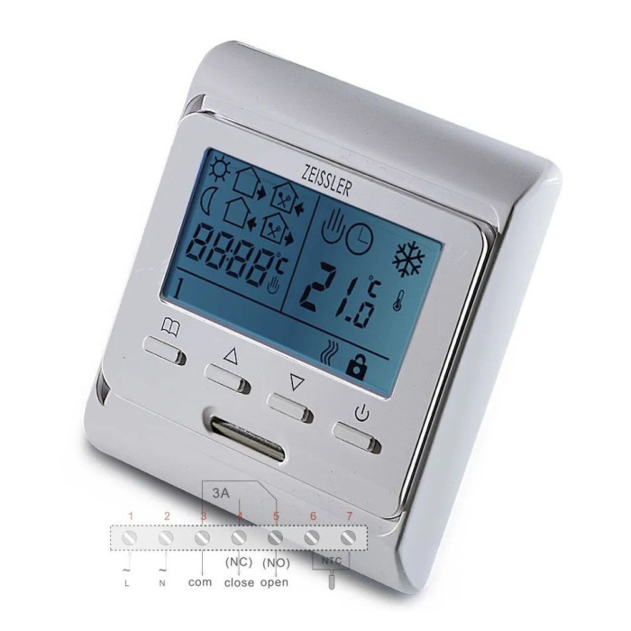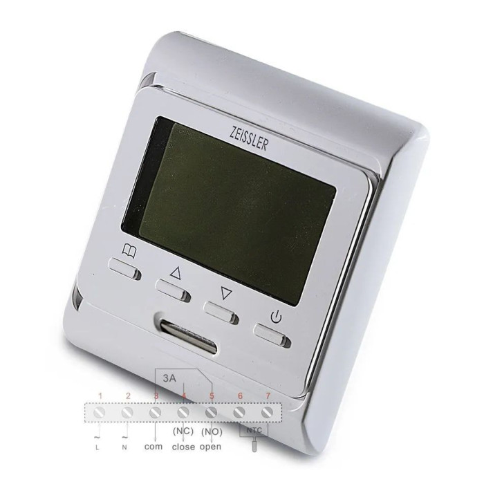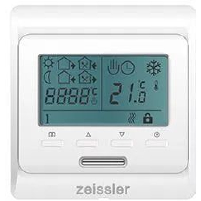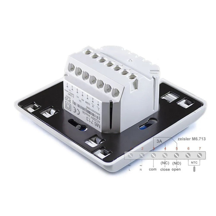 Комнатный термостат Zeissler M6.713. Предназначен для управления температурой воздуха в помещении по встроенному датчику, а также контролю температуры пола по выносному датчику (покупается отдельно). Подходит для управления водяным теплым полом.