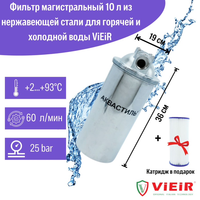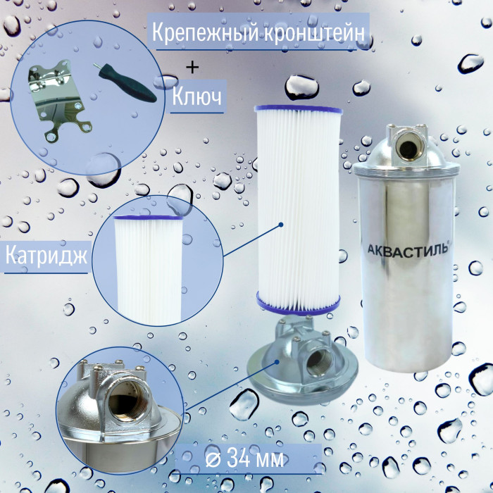 Описание Фильтр колбовый магистральный +картридж "Аквастиль"Аквастиль" 10л "НЕРЖАВЕЙКИ"для горячих и холодных воды (6 шт)