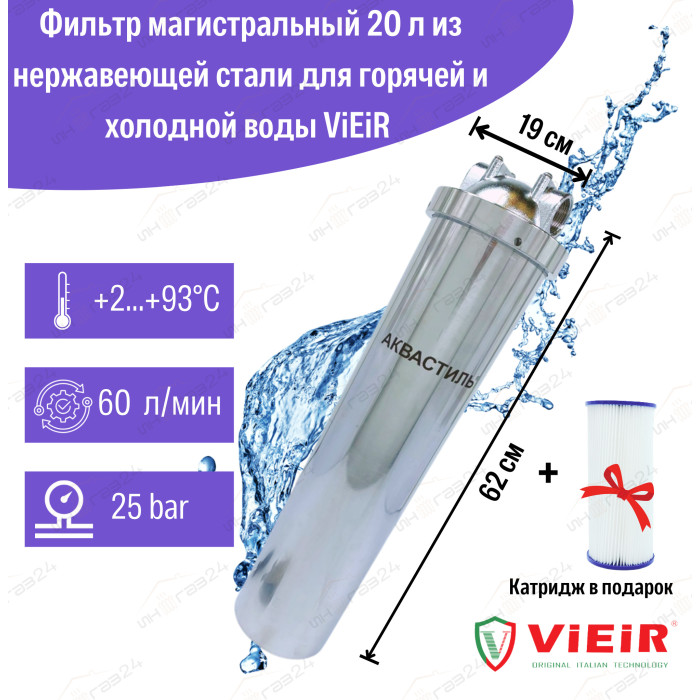 Описание Фильтр колбовый магистральный +картридж "Аквастиль"Аквастиль" 20л "НЕРЖАВЕЙКИ"для горячих и холодных воды (6 шт)