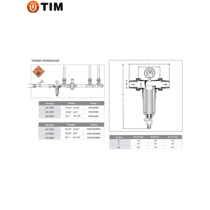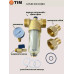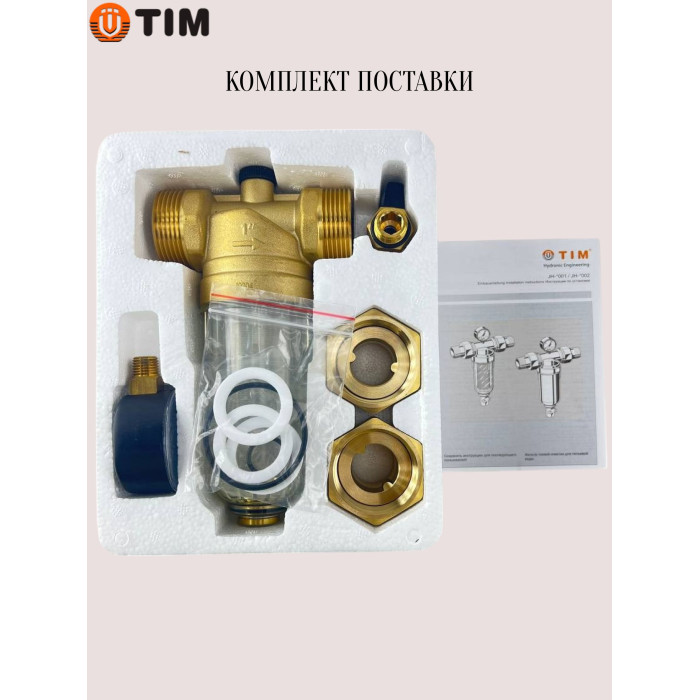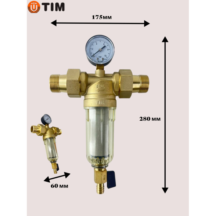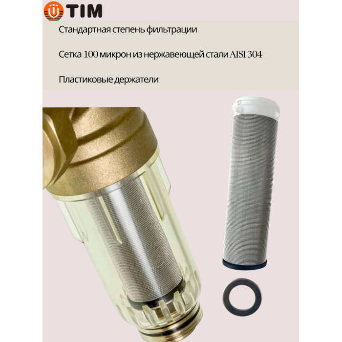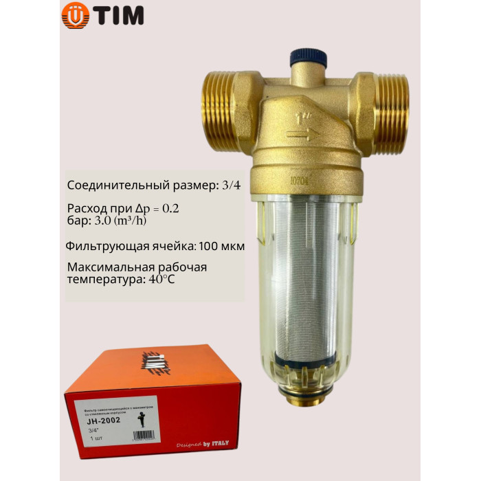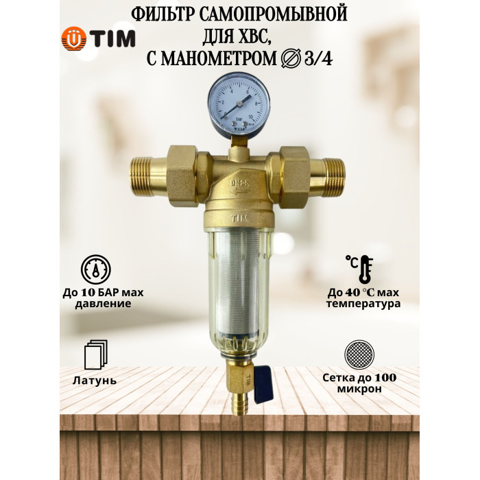 Самопромывной фильтр TIM 3/4 с манометром и пластиковым корпусом для защиты систем водоснабжения от твёрдых механических примесей. Для изготовления фильтра использована латунь, сетка выполнена из нержавеющей стали. В состав конструкции входят манометр для контроля давления в системе.