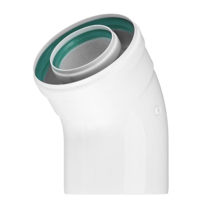 Универсальное, поворотное, раструбное соединение "папа/мама". Используется для изменения направления дымохода на 45°. Колено Ø100 - сталь. Колено Ø60 - алюминий. Индивидуальная упаковка + коллективная упаковка 36 штук.