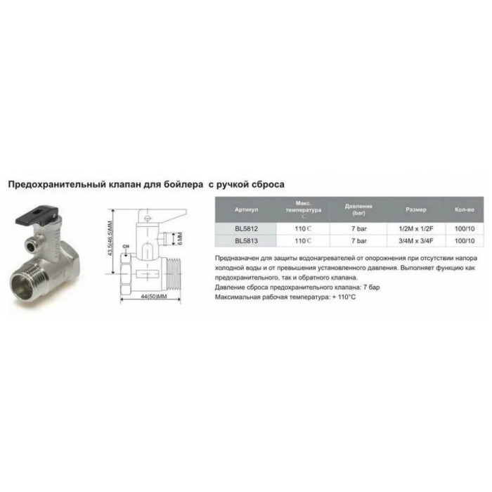 Основные характеристики Предохранительный клапан для бойлера с ручкой сброса. 1/2" -7бар(10/100)
