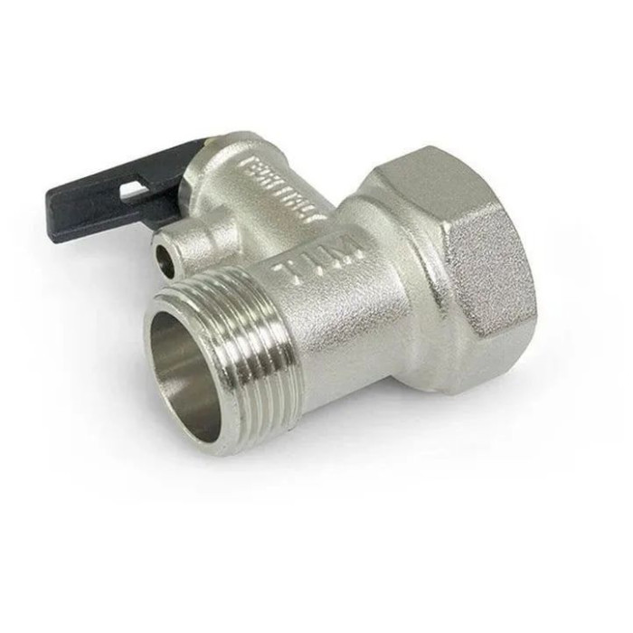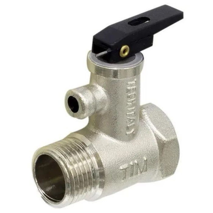 Предохранительный клапан TIM 1/2 для бойлера с ручкой. предназначен для защиты водонагревателя от опустошения при потере напора холодной воды и от превышения установленного давления. Он выполняет функцию как обратного, так и предохранительного клапанов и оснащен ручкой ручного сброса.