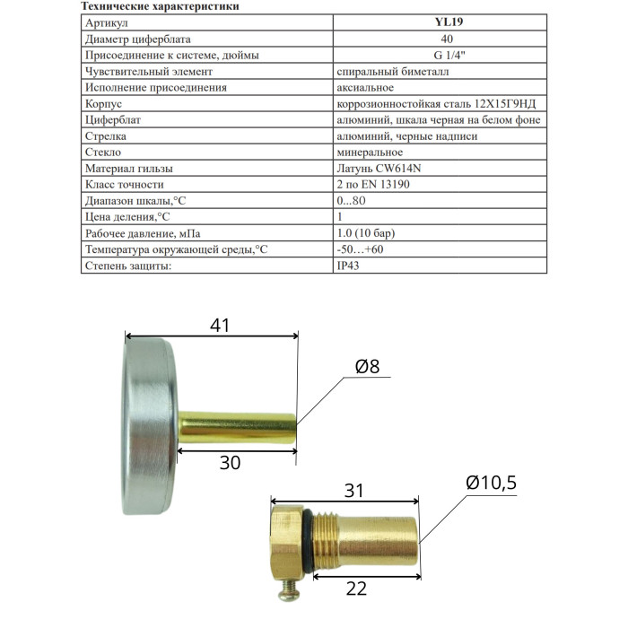 Описание Термометр биметаллический d 40мм, с погружной гильзой "ViEiR" (200/1шт)