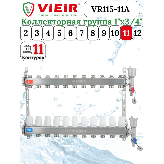 Описание Группа коллекторов без расход. 11 -вых. НЕРЖ. БЕЗ КРАНОВ 1"x3/4" "ViEiR" (2/1шт)