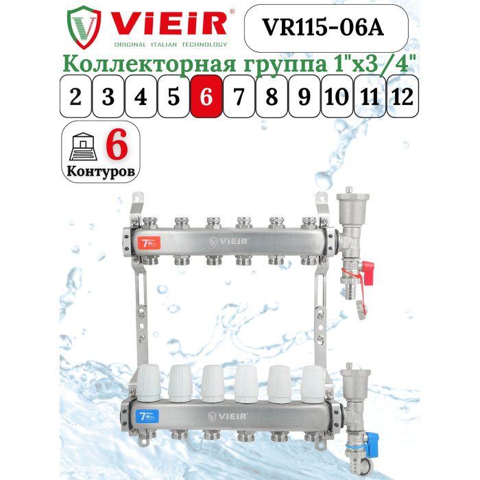 Описание Группа коллекторов без расход. 6 -вых. НЕРЖ .БЕЗ КРАНОВ 1"x3/4" "ViEiR" (5/1шт)
