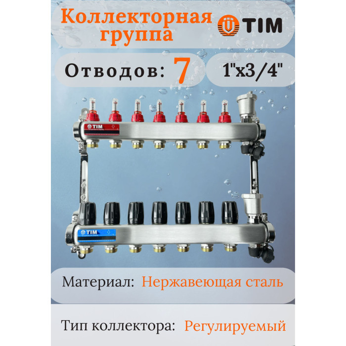 Коллектор TIM на 7 выходов из нержавеющей стали с расходомерами (артикул: KCS5007) применяется в напольных системах отопления для распределения и регулирования теплоносителя.