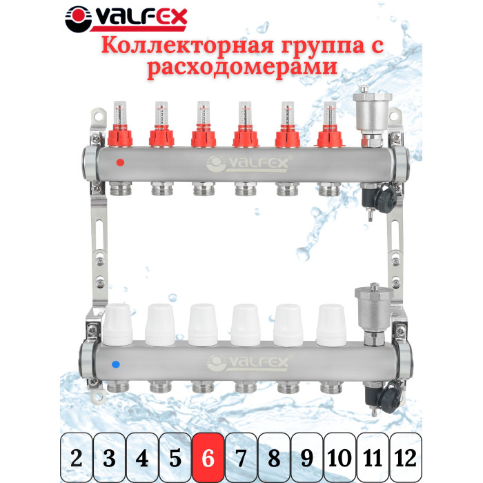 Описание Коллекторная группа НЕРЖ со встр. расх. в сборе, 1"х 6 вых. Евроконус 3/4" VALFEX (2) К