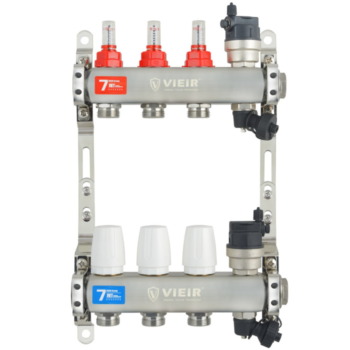 VIEIR Коллекторная группа из нержавеющей стали с расходомерами, без вводных кранов, 3 выхода, 1"х3/4" — ключевой распределительный узел для балансировки и управления несколькими контурами водяного теплого пола. Этот элемент системы теплого пола решает задачу равномерного распределения теплоносителя по петлям, обеспечивая стабильный прогрев поверхности. Использование данной коллекторной группы повышает энергоэффективность всей системы, упрощает настройку гидравлики и гарантирует надежность соединений на протяжении всего срока службы.