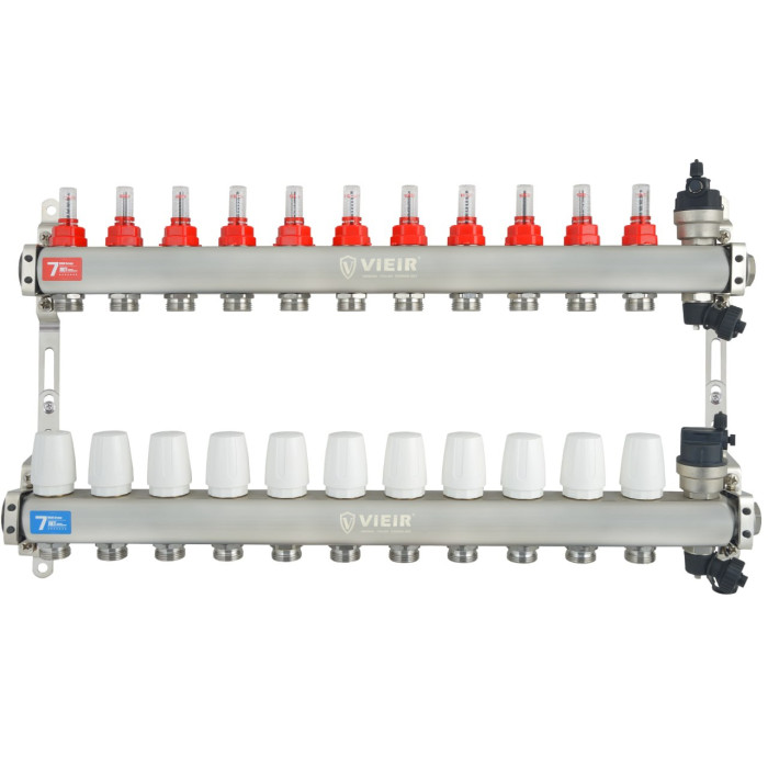 VIEIR Коллекторная группа из нержавеющей стали с расходомерами, без вводных кранов, 11 выходов, 1"х3/4" — ключевой узел для балансировки и управления водяным теплым полом. Этот элемент системы теплого пола служит для равномерного распределения теплоносителя по 11 независимым греющим контурам, что решает проблему неравномерного прогрева поверхности. Использование данной коллекторной группы VIEIR обеспечивает надежность соединения всех трубопроводов, упрощает процесс монтажа и настройки, а также способствует повышению энергоэффективности всей низкотемпературной системы отопления.
