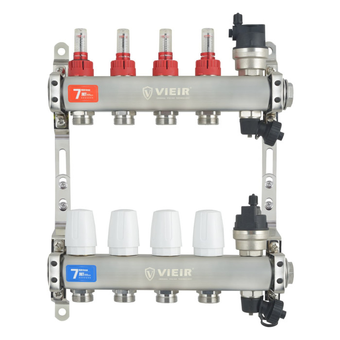 VIEIR Коллекторная группа из нержавеющей стали с расходомерами, без вводных кранов, 4 выхода, 1"х3/4" — ключевой узел для балансировки и управления водяным теплым полом. Этот элемент служит для равномерного распределения теплоносителя по четырем независимым контурам системы теплого пола, обеспечивая стабильный и комфортный обогрев. Использование данной коллекторной группы решает проблему неравномерного прогрева поверхности, упрощает настройку и повышает общую энергоэффективность отопительного контура. Надежные соединения и продуманная конструкция гарантируют долговечность и безотказную работу всей инженерной системы.