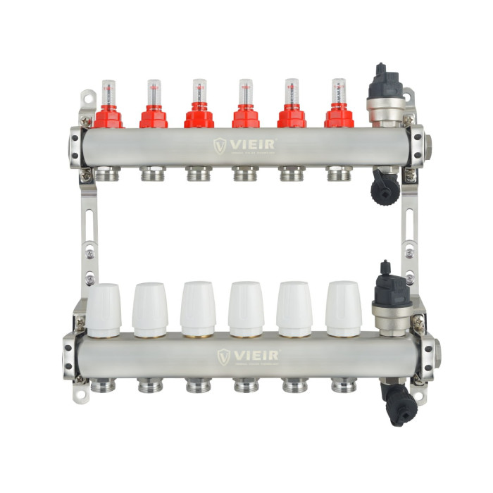 Заказывайте VIEIR Коллекторная группа из нержавеющей стали с расходомерами, без вводных кранов, 6 выходов, 1"х3/4" для надежного монтажа теплого пола с доставкой по всей России!