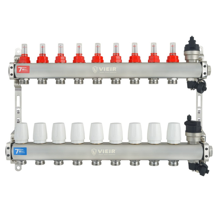 VIEIR Коллекторная группа из нержавеющей стали с расходомерами, без вводных кранов, 9 выходов, 1"х3/4" — ключевой распределительный узел для создания эффективной и сбалансированной системы водяного теплого пола. Этот элемент служит для равномерного распределения теплоносителя по нескольким независимым контурам, что является основой для комфортного и экономичного обогрева. Использование данной коллекторной группы решает проблему неравномерного прогрева поверхности пола и позволяет индивидуально настраивать расход в каждом петлевом контуре. Конструкция обеспечивает надежность всех соединений, значительно упрощает процесс монтажа и последующего обслуживания системы, а также способствует повышению общей энергоэффективности греющего контура.