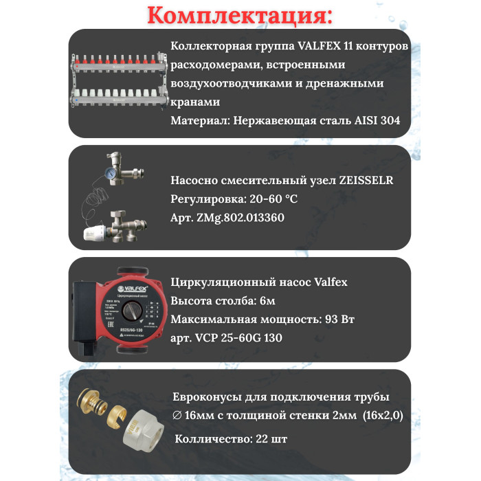 Основные характеристики Комплект для теплого пола на 11 контура VALFEX (до 220 м.кв) под трубу 16х2,0
