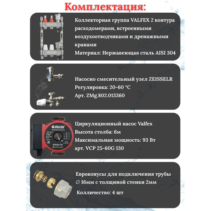 Основные характеристики Комплект для теплого пола на 2 контура VALFEX (до 40 м.кв) под трубу 16х2,0