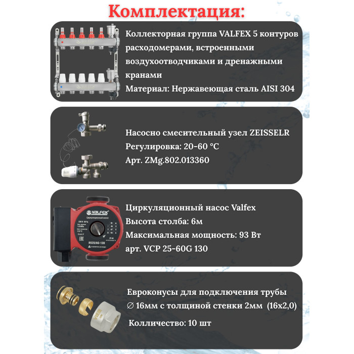 Основные характеристики Комплект для теплого пола на 5 контура VALFEX (до 100 м.кв) под трубу 16х2,0