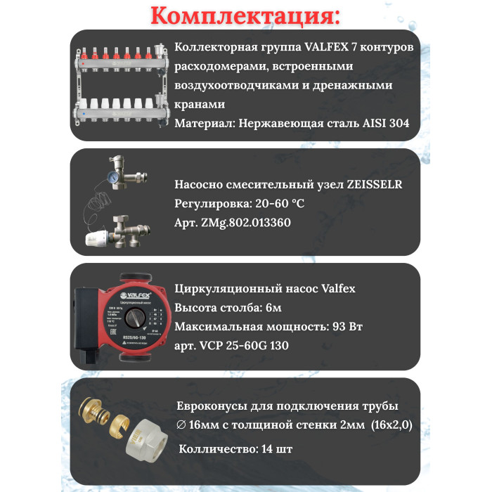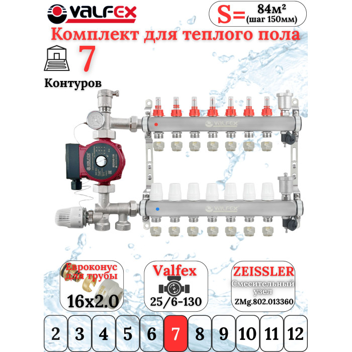 Основные характеристики Комплект для теплого пола на 7 контура VALFEX (до 140 м.кв) под трубу 16х2,0