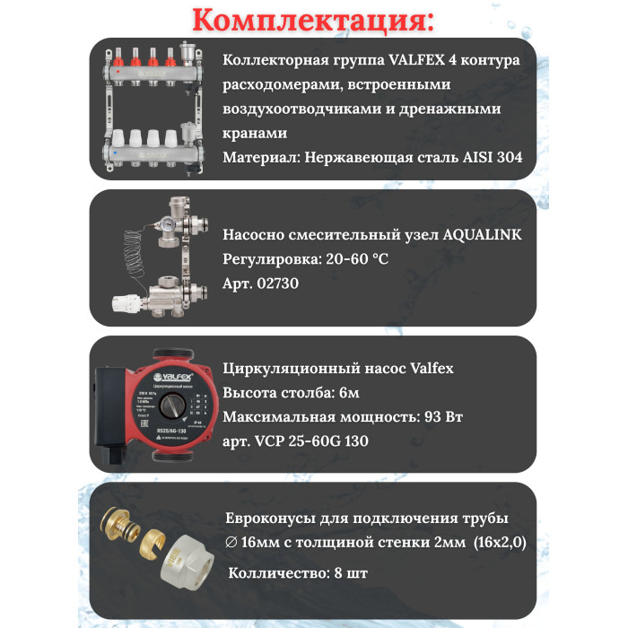 Основные характеристики Комплект для теплого пола на 4 контура VALFEX (до 80 м.кв) под трубу 16х2,0