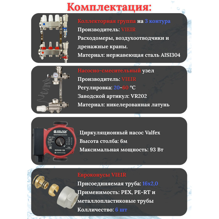 Основные характеристики Коллектор для теплого пола 3 контура (комплект) VIEIR + насосно смесительный узел с насосом + евроконус для коллектора 3/4'-16*2,0
