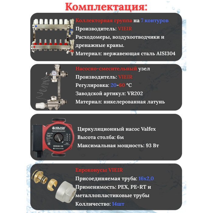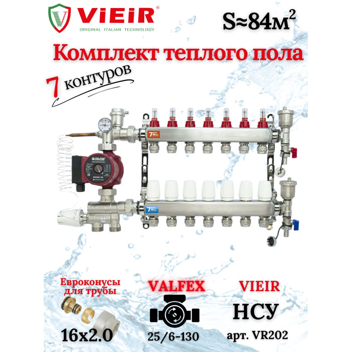 Основные характеристики Коллектор для теплого пола 7 контуров (комплект) VIEIR + насосно смесительный узел с насосом + евроконус для коллектора 3/4'-16*2,0