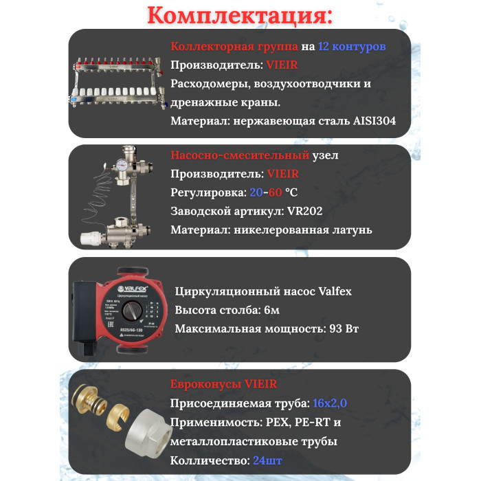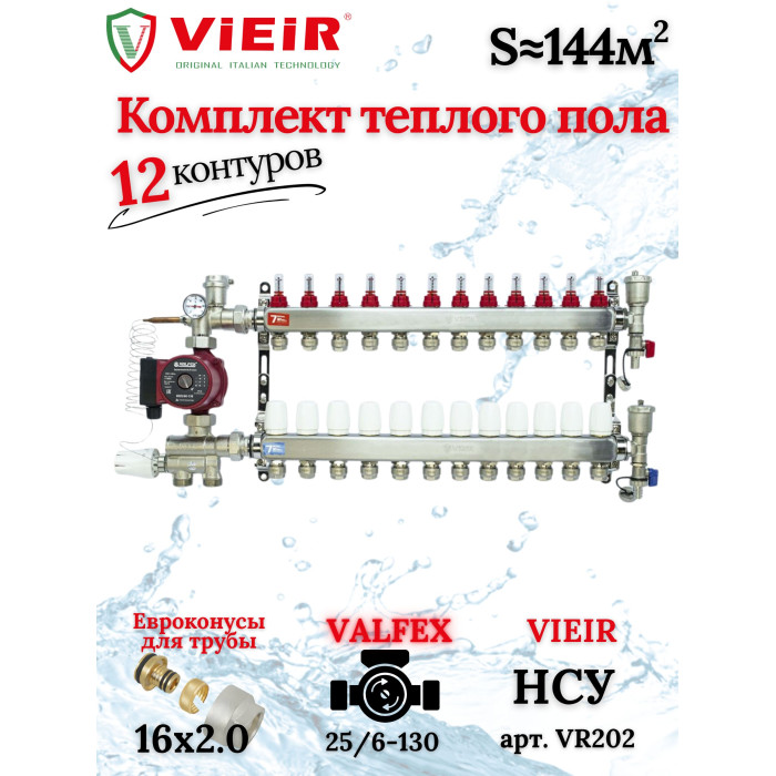 Основные характеристики Коллектор для теплого пола 12 контуров (комплект) VIEIR + насосно смесительный узел с насосом + евроконус для коллектора 3/4'-16*2,0
