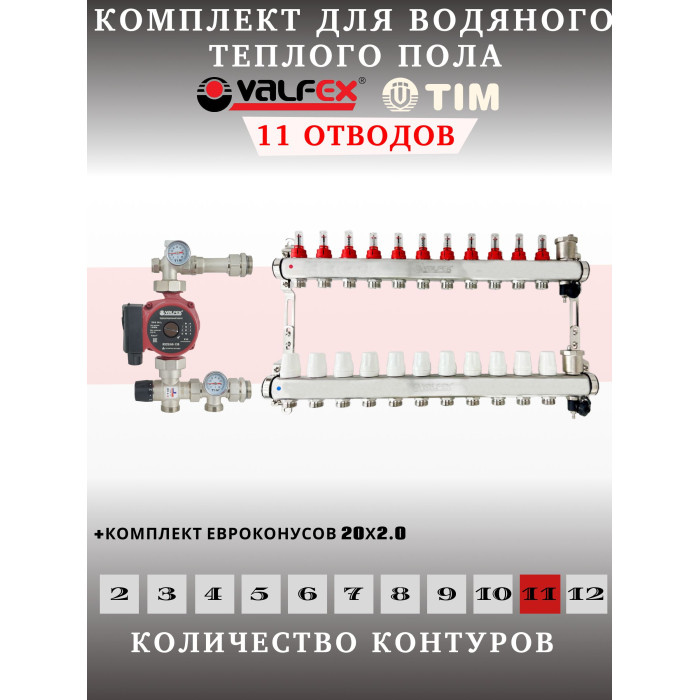 Основные характеристики Комплект для теплого пола на 11 выходов VALFEX (Коллектор на 11 контуров, Насос циркуляционный , Евроконусы(20x2,0), Насосно-Смесительный узел) до 130 кв.м