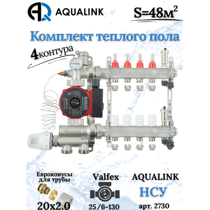 Описание Комплект тёплого пола на 4 конутра, Коллектор+Насос+НСУ+Евроконусы 20x2,0