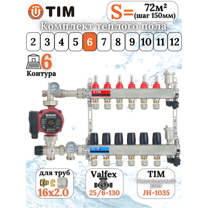Основные характеристики Комплект для теплого пола на 6 выходов (Коллектор на 6 контуров, Насос циркуляционный , Евроконусы 16x2,0, Насосно-Смесительный узел) до 80 кв.м