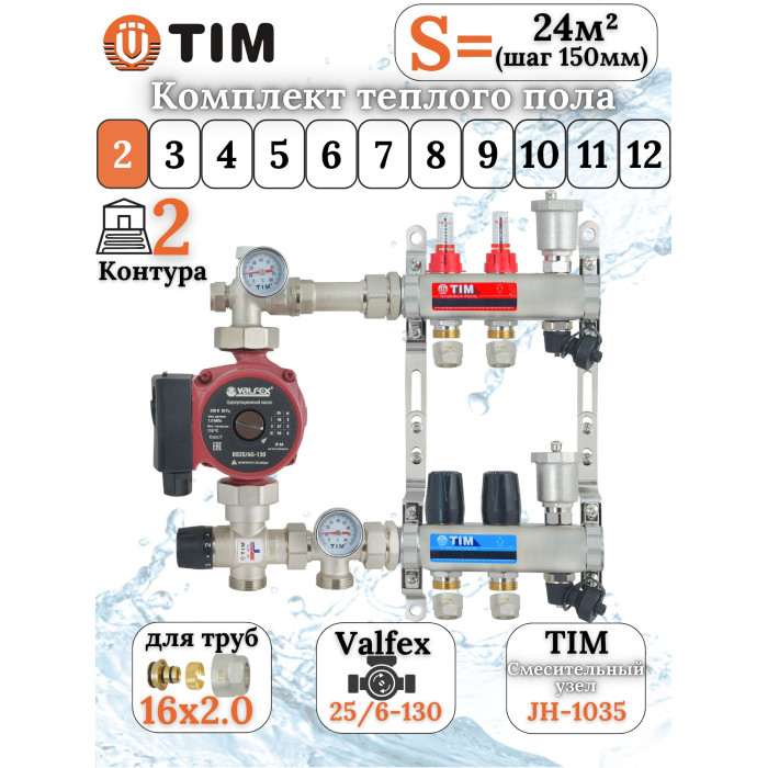Описание Комплект для теплого пола на 2 выхода (Коллектор на 2 контура, Насос циркуляционный , Евроконусы 16x2,0, Насосно-Смесительный узел) до 40 кв.м