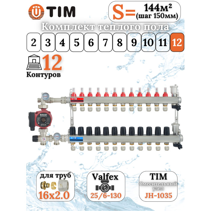 Описание Комплект для теплого пола на 12 выходов (Коллектор на 12 контуров, Насос циркуляционный , Евроконусы 16x2,0, Насосно-Смесительный узел) до 140 кв.м