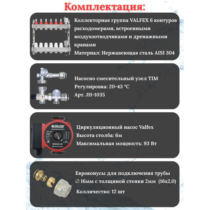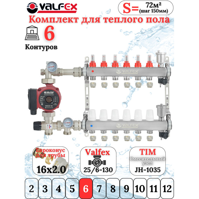 Основные характеристики Комплект для теплого пола на 6 выходов VALFEX (Коллектор на 6 контуров, Насос циркуляционный , Евроконусы, Насосно-Смесительный узел) до 80 кв.м
