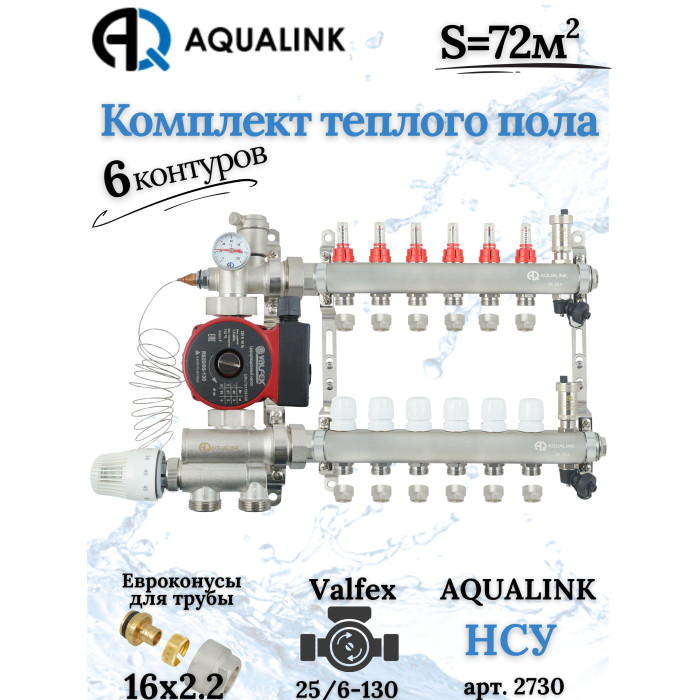 Описание Комплект тёплого пола на 6 конутров, Коллектор+Насос+НСУ+Евроконусы 16х2,2