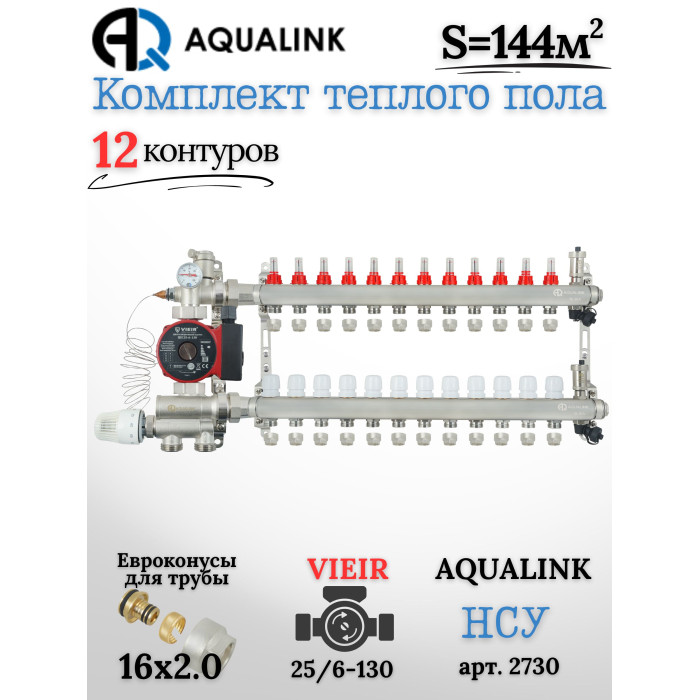 Описание Комплект тёплого пола на 12 контуров, Коллектор(AQUALINK)+Насос(VIEIR)+НСУ(AQUALINK)+Евроконусы 16х2,0