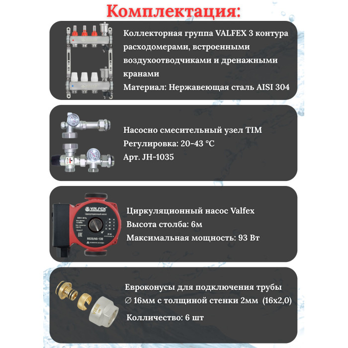 Основные характеристики Комплект для теплого пола на 3 выхода VALFEX (Коллектор на 3 контура, Насос циркуляционный , Евроконусы, Насосно-Смесительный узел) до 60 кв.м
