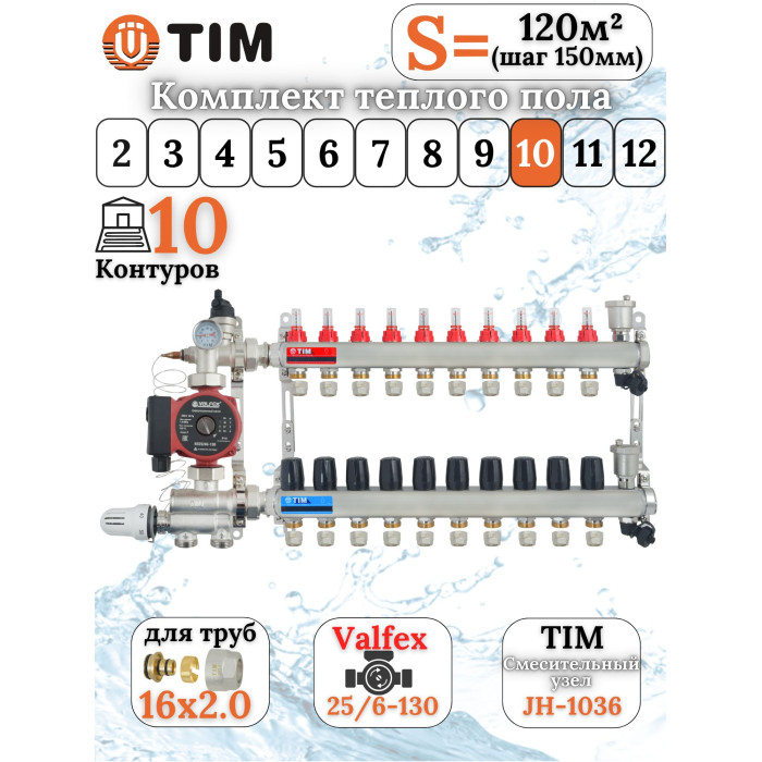Основные характеристики Комплект для теплого пола на 10 выхода (Коллектор на 10 контура, Насос циркуляционный , Евроконусы, Насосно-Смесительный узел) до 120 кв.м
