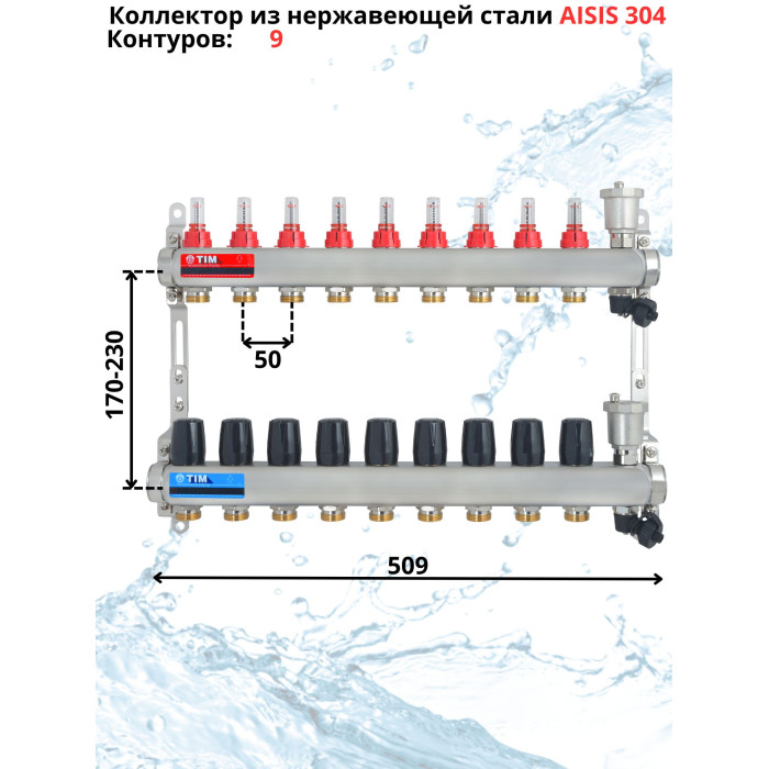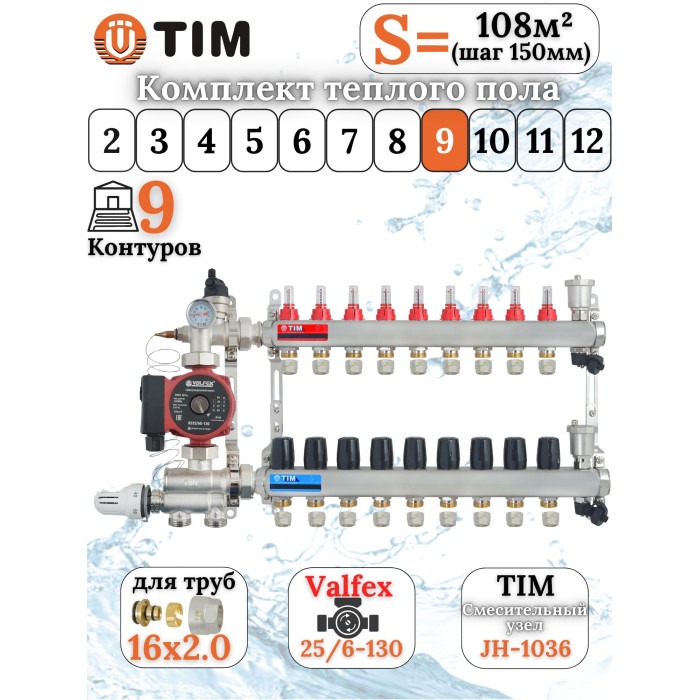 Основные характеристики Комплект для теплого пола на 9 выхода (Коллектор на 9 контура, Насос циркуляционный , Евроконусы, Насосно-Смесительный узел) до 110 кв.м