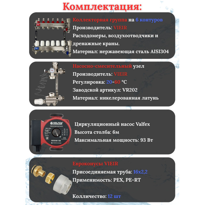 Основные характеристики Комплект для теплого пола на 6 выходов (Коллектор VR113-06A на 6 контуров, Насос циркуляционный , Евроконусы, Насосно-Смесительный узел VR202) под трубу 16мм со стенкой 2.2мм