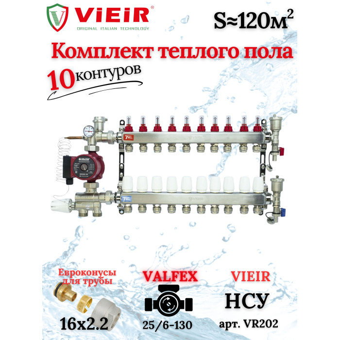 Комплект для теплого пола на 10 выходов (Коллектор VR113-10A на 10 контуров, Насос циркуляционный , Евроконусы, Насосно-Смесительный узел VR202) под трубу 16мм со стенкой 2.2мм