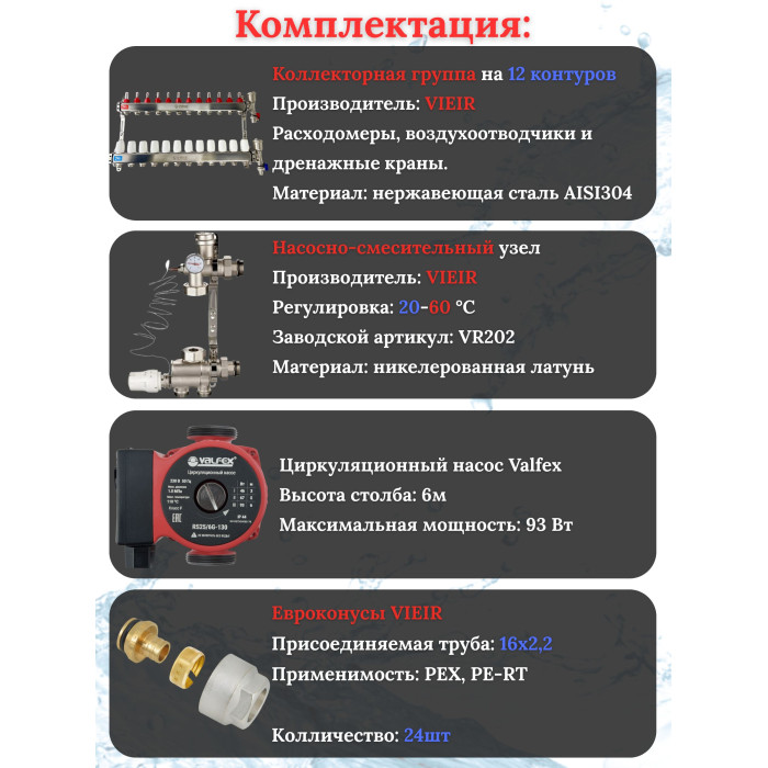 Основные характеристики Комплект для теплого пола на 12 выходов (Коллектор VR113-12A на 12 контуров, Насос циркуляционный , Евроконусы, Насосно-Смесительный узел VR202) под трубу 16мм со стенкой 2,2мм