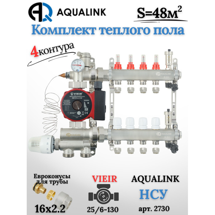 Описание Комплект тёплого пола на 4 контура, Коллектор(AQUALINK)+Насос(VIEIR)+НСУ(AQUALINK)+Евроконусы 16х2,2