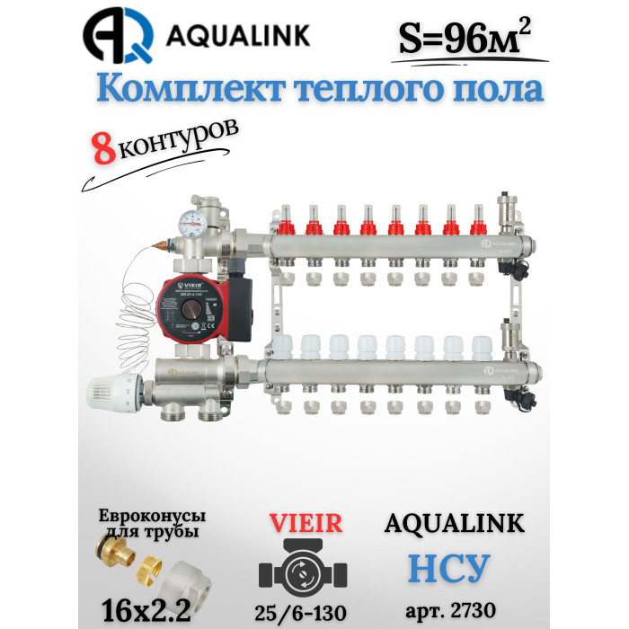 Описание Комплект тёплого пола на 8 контуров, Коллектор(AQUALINK)+Насос(VIEIR)+НСУ(AQUALINK)+Евроконусы 16х2,2
