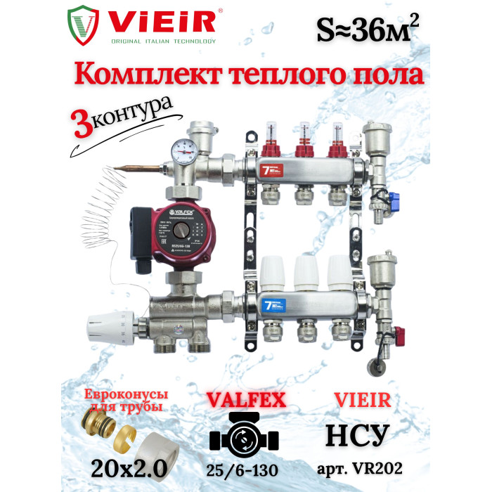 Комплект для теплого пола на 3 выходов (Коллектор VR113-3A на 3 контура, Насос циркуляционный , Евроконусы, Насосно-Смесительный узел VR202) под трубу 20мм со стенкой 2.0мм
