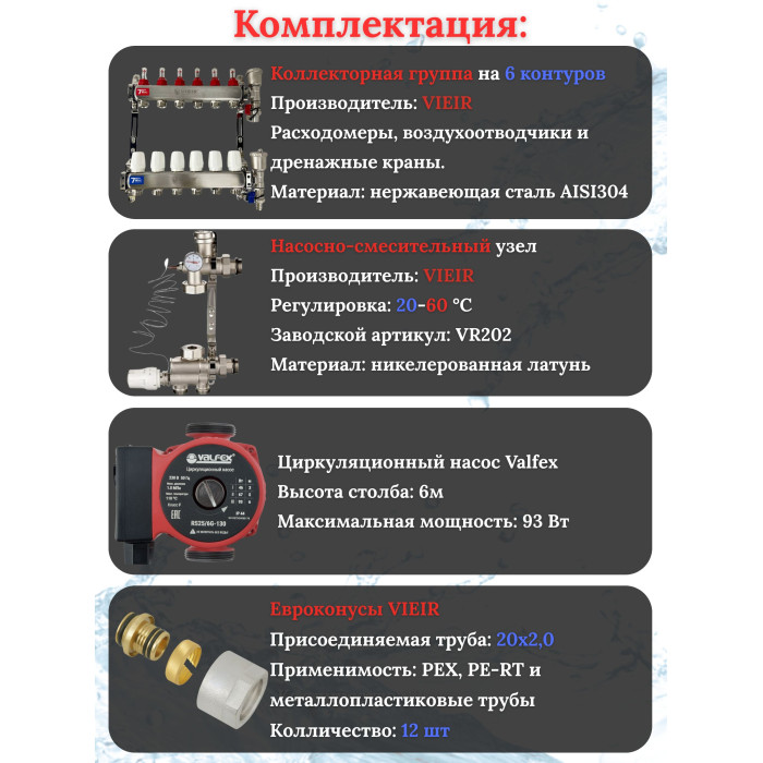 Основные характеристики Комплект для теплого пола на 6 выходов (Коллектор VR113-06A на 6 контуров, Насос циркуляционный , Евроконусы, Насосно-Смесительный узел VR202) под трубу 20мм со стенкой 2.0мм