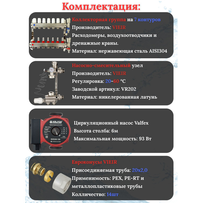 Основные характеристики Комплект для теплого пола на 7 выходов (Коллектор VR113-07A на 7 контуров, Насос циркуляционный , Евроконусы, Насосно-Смесительный узел VR202) под трубу 20мм со стенкой 2.0мм