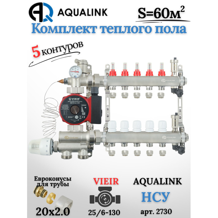Описание Комплект тёплого пола на 5 контуров, Коллектор(AQUALINK)+Насос(VIEIR)+НСУ(AQUALINK)+Евроконусы 20x2,0