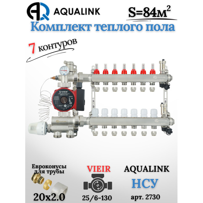 Описание Комплект тёплого пола на 7 контуров, Коллектор(AQUALINK)+Насос(VIEIR)+НСУ(AQUALINK)+Евроконусы 20x2,0