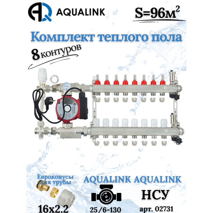 Описание Комплект тёплого пола на 8 контуров, Коллектор+Насос+НСУ с байпасом+Евроконусы 16x2,2