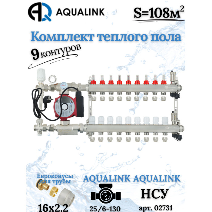 Основные характеристики Комплект тёплого пола на 9 контуров, Коллектор+Насос+НСУ с байпасом+Евроконусы 16x2,2