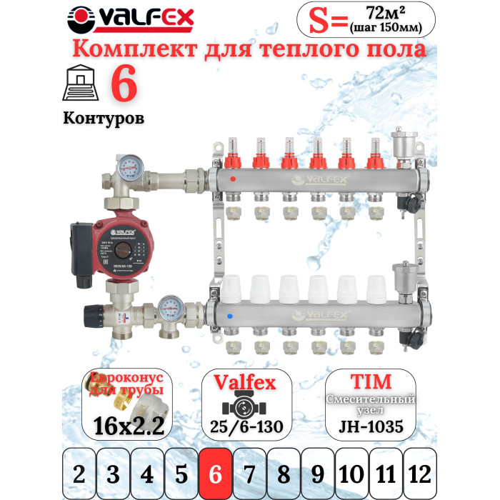 Основные характеристики Комплект для теплого пола на 6 выходов VALFEX (Коллектор на 6 контуров, Насос циркуляционный , Евроконусы(16x2,2), Насосно-Смесительный узел) до 80 кв.м