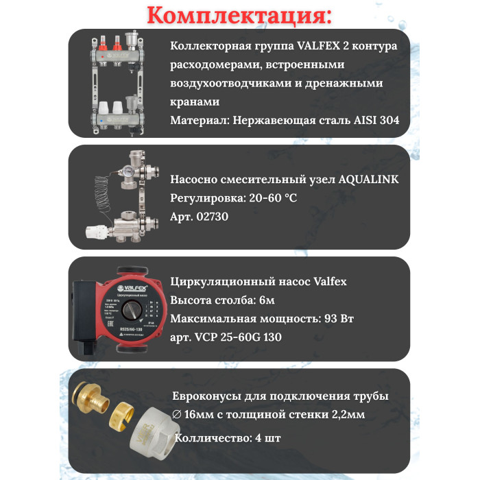 Основные характеристики Комплект для теплого пола на 2 контура VALFEX (до 40 м.кв) под трубу 16х2,2